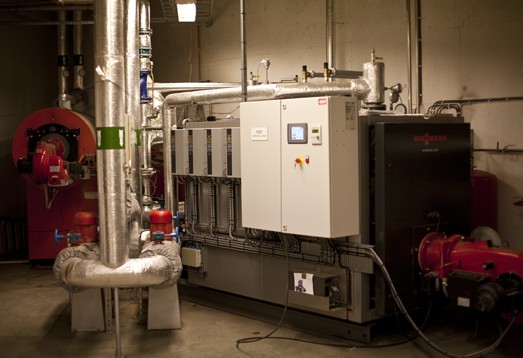 Varmeffekten er 900 kW – og leveres komplett med kjel og gassbrenner samt pumper, vannbehandlingsutstyr og ekspansjonstanker.
